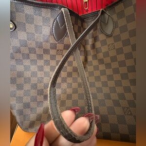 LV Damier Neverfull, GM size in preloved condition with definite signs of wear. The coating of the inside pocket is pealed out, straps are soft, and other signs of wear.
