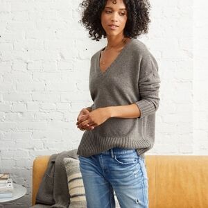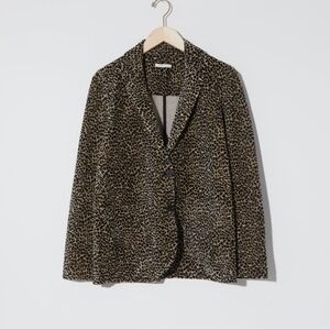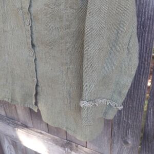 100% linen button down with cropped sleeves, loose fit, and fray detail. Size M. 42" around chest, 23" long. Great condition!