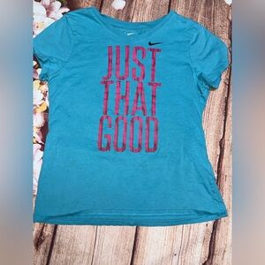 Blue short sleeve tee with bold pink 'Just That Good' print. Ideal for everyday wear.