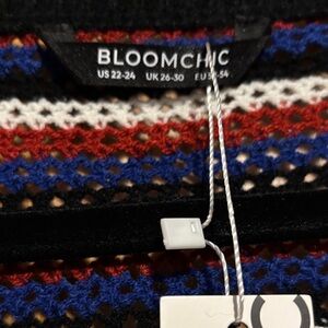 Stylish knit sweater with red, blue, and white stripes. Perfect for any occasion.