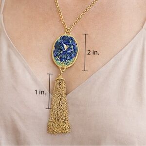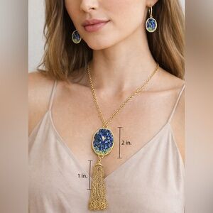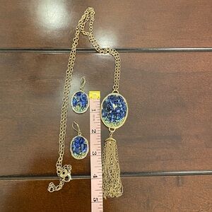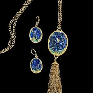 Features a gold-tone chain with a striking blue stone mosaic pendant and tassel detail, paired with coordinating drop earrings. The rich blue stones and gold setting make this a bold yet elegant statement piece.