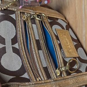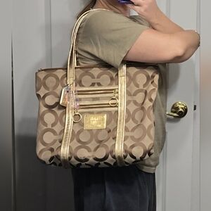 Coach Poppy op art Glam tote in khaki signature fabric with metallic gold leather trim