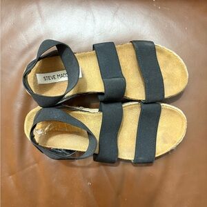 Adorable black Steve Madden platforms! Comfy stretchy straps. No size tag but based on measurements is 7.5-8. One of the Steve Madden labels has come off the sole