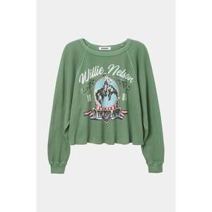 Embrace your adventurous spirit with the Rayna Willie Nelson Crop Crew Neck by Daydreamer, crafted for an effortlessly stylish journey. This long sleeve sweatshirt in stone green features a cropped length and a solid waffle texture for a unique look. Neckline: Crewneck. Closure: Pull on. Perfect for fall travels and inspired by the iconic Willie Nelson, it's a must-have for your Western-inspired wardrobe.