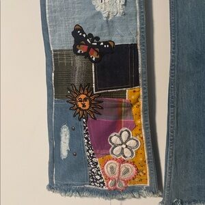 Stylish blue jeans with unique patchwork design. Features colorful patches and playful embellishments. Perfect for a trendy look.