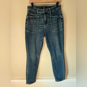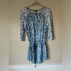 Stylish navy and white striped shirt from Express. Features button-down front and dual chest pockets. Ideal for versatile wear.