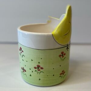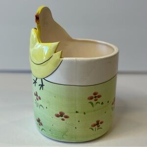 Adorable chick planter or candy jar for Easter. This appears to be hand painted with flowers and green leaves and grass. Stands 6” tall at the height of the tallest chick and 4” wide. Great decor! No chips or cracks, great pre-owned condition.