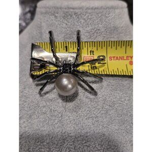 Gunmetal Spider Pendant Brooch Faux Silver Pearl Body & Black Rhinestone 2x1.75"
