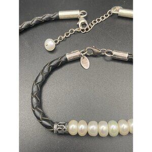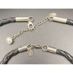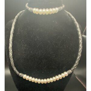 Necklace & Bracelet Set Sterling Silver Freshwater Pearls Braided Black Leather