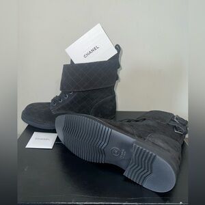 Step up your style with these authentic Chanel combat boots crafted in luxurious black suede with quilted detailing. Featuring a fold-over cuff with buckle strap, lace-up front, and sturdy sole, these boots perfectly balance edgy and chic.