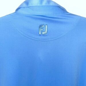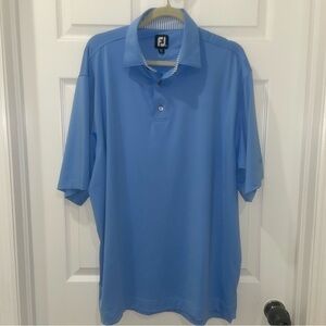 men's FootJoy brand golf polo shirt, new with tags, size large. sky blue color. fabric is a polyester spandex blend for a little added stretch. double stitch seams, anti microbial fabric, extra long back shirt tail.