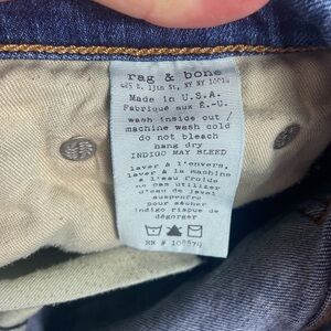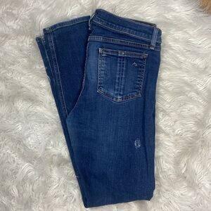 Rag & Bone Dark Wash High Rise Skinny Jeans, slightly distressed, 5 pocket design, button/zip closure. No stretch.