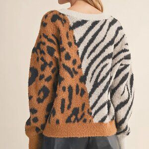Turn heads and unleash your wild side in this ultra-chic, two-toned statement sweater. Half fierce zebra, half sultry leopard, this bold mashup is made for the fashion lover who isn’t afraid to stand out. The fabric is luxuriously soft to the touch—cozy like your favorite blanket, yet irresistibly sexy with its daring mix of prints and playful oversized fit.