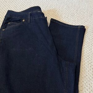 Stylish and comfortable women’s straight leg dark blue jeans, perfect for any casual occasion. Woman within size 14. Waist measures 34 inches. Rise measures 11 inches. 32 inch inseam. Straight leg.