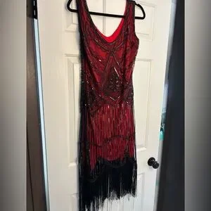 Stunning red dress with intricate black beading and fringe details. Perfect for halloween or a great gatsby party!