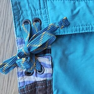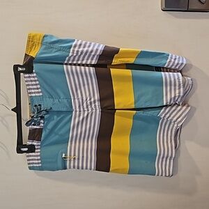 Patagonia Teal Yellow Striped Colorblock Wayfarer Swim Trunks Board Shorts 40