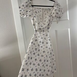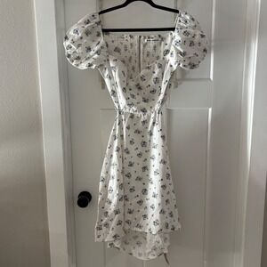 Keywords: Reformation dress, floral mini dress, off shoulder dress, puff sleeve dress, cutout dress, white dress, size 12 dress, summer dress, aline dress, party dress, casual dress, lined dress, sweetheart neckline, smocked dress