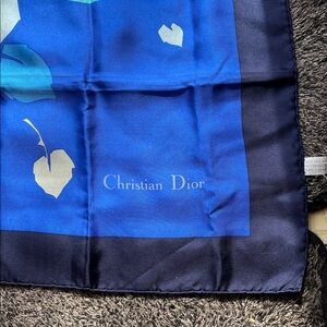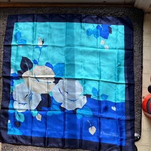 Elegant CHRISTIAN DIOR scarf with blue light and dark colors. floral leaf design. Luxurious 100% silk