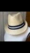 This ivory weave hat has a 1 1/2" brim that dips down in the front and rolls-up along the back of the brim with a 4" pinchfront crown and a striped ribbon hatband. Get this lightweight fedora now and spruce up your summer look!