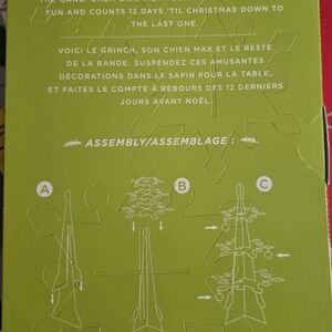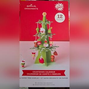 Hallmark Grinch Countdown Calendar with green and red colors. Includes 12 ornaments and a paper tree display.