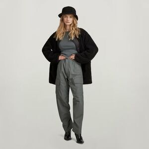 High-waist trousers with front darts and a wide-leg design. Front pockets and false rear flap pocket. Front zip fly, inside button and metal hook fastening.