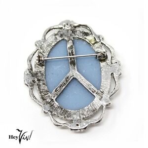 * Special Feature: Vintage 1980's New Old Store Stock blue and white cameo pin brooch with ornate edge and rhinestones.