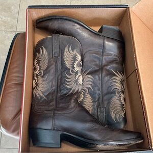 Elegant Lucchese boots crafted from premium Mad Dog Goat leather. Rich brown color adds sophistication.