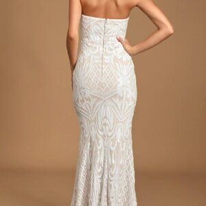 Brand New, with tags! Lulus Exclusive! The allure of the Lulus Olivia White Sequin Strapless Maxi Dress is absolutely irresistible! Sparkling white sequins create an Art-Deco-inspired design atop this elegant gown with a strapless, sweetheart bodice (with no-slip strips and darting). Fitted waist cascades into a mermaid maxi skirt. Hidden back zipper/clasp.