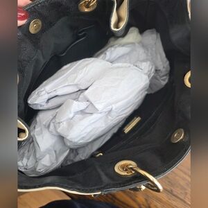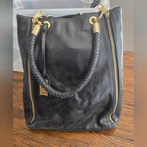 Stylish black and cream shoulder bag. Features gold hardware and braided handle. Ideal for versatile use. Some wear.