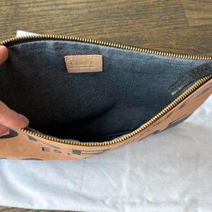 Stylish Clare V pouch with bold 'Spring Is Here' text. Features blue & black colorway - natural tan leather that is soft and gets better with age - note marks on leather that come with it aging - no dirt or stains inside or out