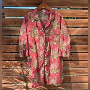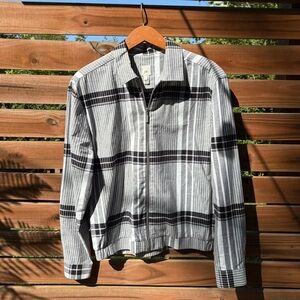 Stylish plaid shirt jacket. Features navy and yellow pattern. Lightweight and versatile. Perfect for layering.