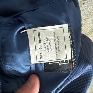 Stylish blue checkered blazer. Two-button closure. Classic notch lapel. Perfect for formal occasions.