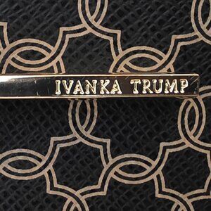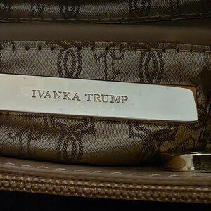 Ivanka Trump Tan/Brown Faux Leather Handbag with Gold Accents around the handles, zippers and the shoulder strap. "Ivana Trump" name embossed on the outside gold zipper pull and inside the first section. Soft Gold Tone lining, there are three (3) sections inside the purse with one (1) zipper pocket on the back side. There is a small mark on the bottom of the purse (see picture) otherwise in nice clean condition.