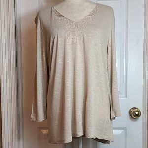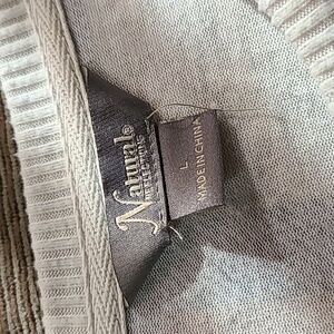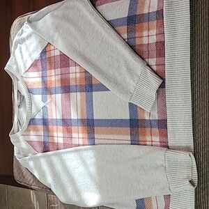 Long Sleeve, Rounded Neckline, Lightweight Sweater, Plaid Body in Brown, Burgandy, and Blue, With Gray Sleeves, Soft and Plush, Size Large.