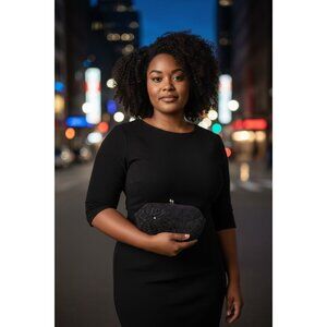 VTG Gala Japan Formal Clutch Black Beaded Floral Silver Kiss Lock Handbag 1960s