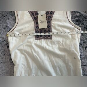 V-neck with embroidery encircling entire neckline. Embroidery at bottom Hem of dress. Bright white color with burgundy and navy embroidery. Fully lined. Sleeveless, a line cut. Chord style belt with tassels. This adorable dress is brand.