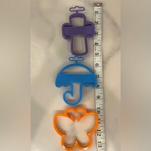 Wilton cookie cutters in vibrant colors. Includes cross, umbrella, and butterfly shapes.
