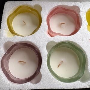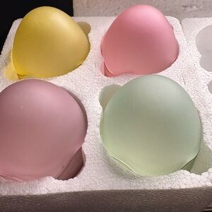 Set of frosted egg-shaped candle holders in pastel colors. Perfect for Easter decor.