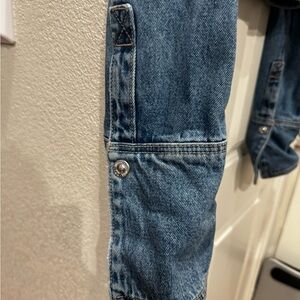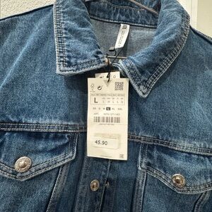 Chic cropped denim jacket. Features button closures and chest pockets. Ideal for casual wear. Size large New never worn….unique sleeves can be worn straight or fold it back