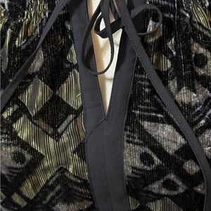 Elegant tunic with striking black and gold pattern. Features a stylish tie neckline and flowing sleeves. Perfect for a fashionable look.