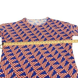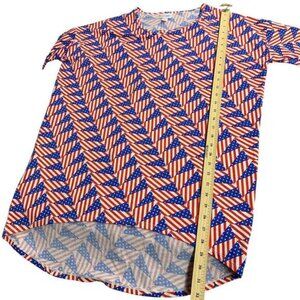 Show off your patriotic side with this new with tags LuLaRoe Irma tunic shirt top in size small. The multicolor design features a vibrant American pattern that is perfect for any occasion. The short sleeve t-shirt is made for women and is sure to be a standout piece in your wardrobe.