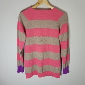 Stay cozy and stylish with this striped pink and tan V-neck sweater. Perfect for any casual outing.