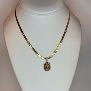This elegant gold necklace features a classic cameo pendant, perfect for adding a touch of sophistication to any outfit. The gold finish adds a luxurious feel, making it a versatile piece for any occasion. Tending Avon like, vintage inspired necklace ✨