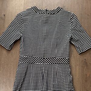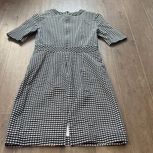 Chic midi dress with a classic black and white pattern. Features a fitted silhouette and short sleeves. Ideal for versatile styling.