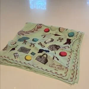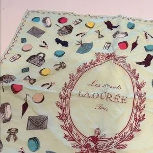Elegant Ladurée Paris scarf featuring a vibrant print. Perfect for adding a touch of luxury to any outfit or would look great framed and hanging on the wall.