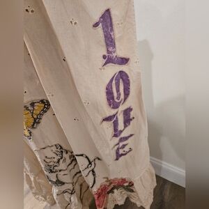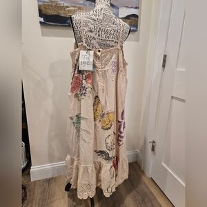 European cotton dress with eyelet and tattered lace detailing, featuring appliqués of butterflies, flowers, and stars and the wording