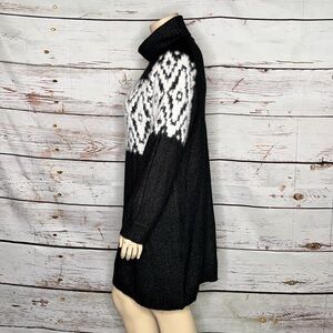 Stylish long sleeve dress. Features a black and white pattern. Cozy and elegant design.