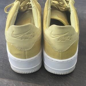 Vibrant yellow Airforce 1 Nike sneakers with a sleek design. Features a perforated toe and classic white sole.