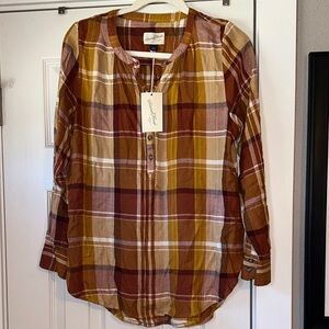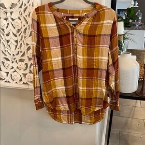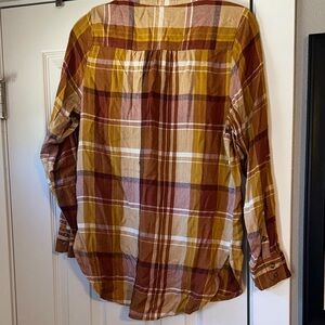 Casual plaid shirt with button-up front. Features rich brown and gold tones. Ideal for everyday wear.