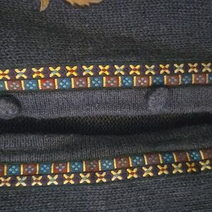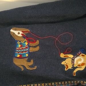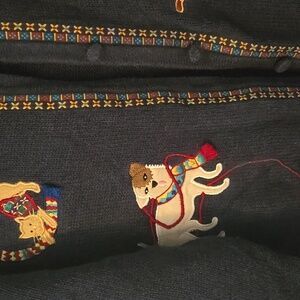 Dark blue cardigan with colorful animal designs. Fun and stylish. Seven buttons. True to size, not oversized.